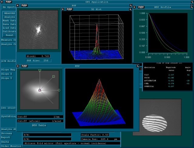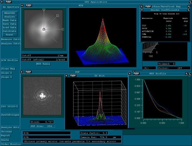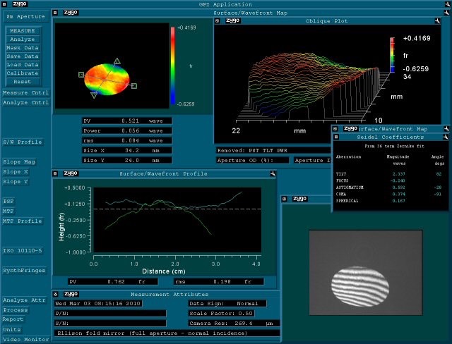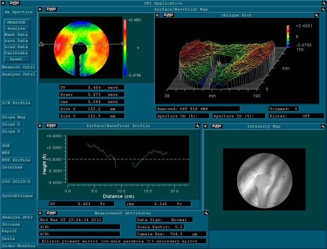 Here is the result for the telescope as a system. The fold mirror was supported on axis at 45 degrees(giving rise to the shadow on the map plots) and the test reference sphere was mounted at the focus, outside the field of view of the Zygo.